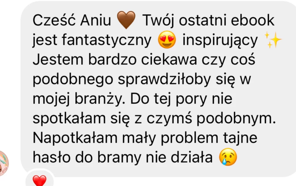 Zależy mi, żeby moje kursy rzeczywiście były wartościowe dla Twojego małego biznesu. Jeśli uznasz, że kurs i dołączone do niego materiały nie były pomocne, oddam Ci Twoje pieniądze! Wystarczy, że wyślesz do mnie maila z krótką informacją, dlaczego zwracasz produkt. Nie będę o nic więcej pytać! 🙂