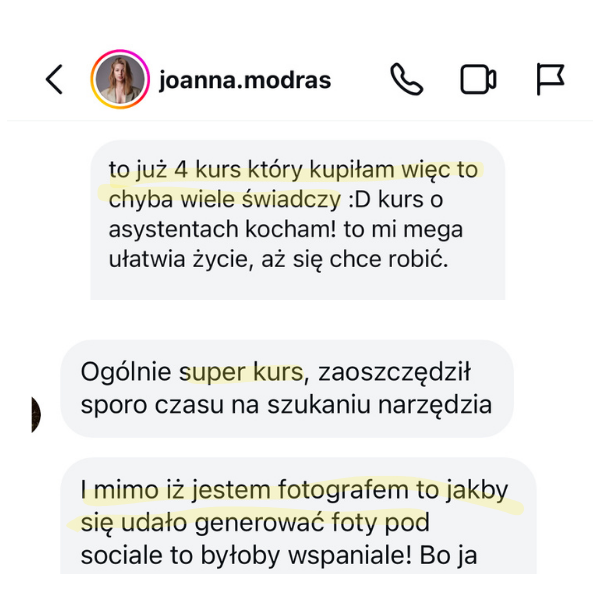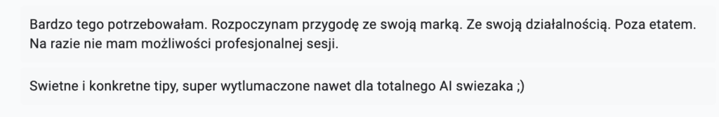 Dlatego zaczęłam wykorzystywać AI także do zdjęć! Okazało się, że można mieć świeże, spójne wizualnie zdjęcia bez makijażu, dojazdów i stresu. I tym właśnie dzielę się w tym kursie – lekko, konkretnie i krok po kroku!
